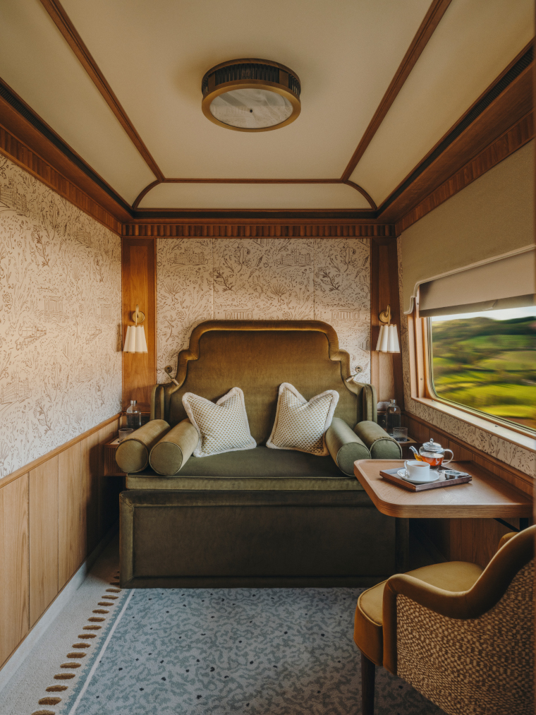 London based design studio Albion Nord created a quintessentially British interior for the Britannic Explorer, a Belmond train, with bold and opulent fabrics, textures and patterns creating a space ‘as layered and inviting as a luxurious British home, with hidden elements that surprise and delight’